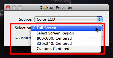 そして「Selection (範囲)」ですが、選択した画面の「フルスクリーン」「任意の範囲」「中央の800×600ピクセル」「中央の320×240ピクセル」「中央の任意サイズ」を選びます。